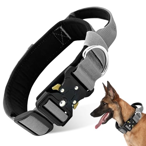 Boloshine Taktisches Hundehalsband, Verstellbare Halsband mit Kontrollgriff, Militär-Hundehalsband mit Robuster Metallschnalle für Mittlere Große Hunde Jagd Training Freizeit (Grau, XL)