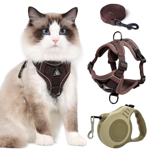 TYXHXTF Katzengeschirr mit Leine Ausbruchsicher Set, Katzen Automatisch Einziehbare Leine 3m (Kaffee)