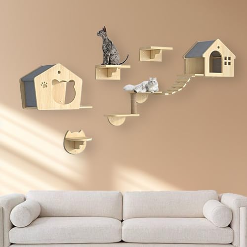 XMLYSMYS Katzentreppe Wand, Katzen Kletterwand Aus Holz Katzenmöbel Innen Wandpark, Platzsparend, für Katzenliebhaber, Zum Klettern, Schlafen, Spielen(7PCS)
