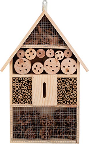 Mit dem XXL Insektenhaus bieten Sie Bienen, Schmetterlingen, Marienkäfern und vielen anderen Insekten ein Zuhause. Dank der verschiedenen Fächer haben die Insekten eine Nistmöglichkeit und Überwinterungshilfe. Verschieden gefüllte Kammern mit Tannenzapfen, Bambus und vieles mehr. Dank eines vorgefertigten Hakens einfach anzubringen ( Nägel nicht enthalten ). Schönes Bienenhotel für ihren Garten oder Terasse.