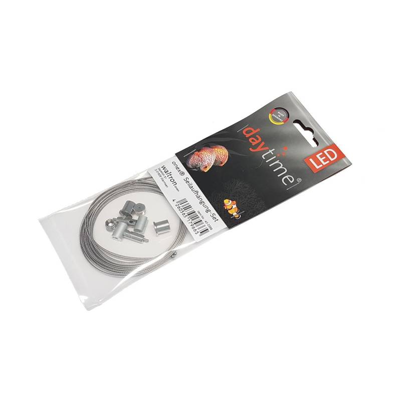 Hochwertige und sehr filigrane Drahtseilaufhängung aus Edelstahl zur freien Aufhängung einer onex über dem Aquarium.