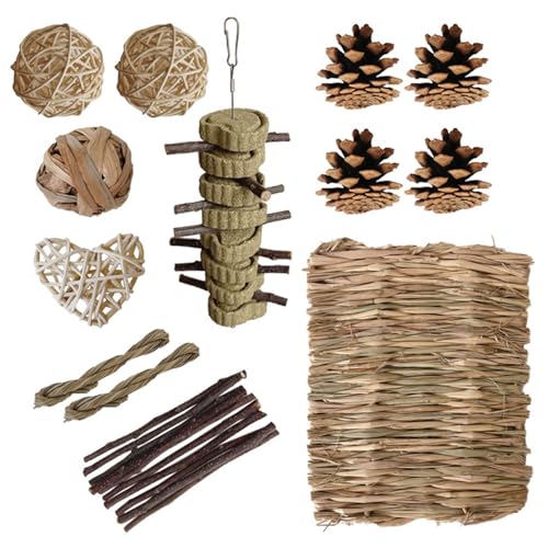 Ein Set von 22 Kieferngras-Pads bietet dem Haustier eine vielfältige Auswahl an Schleifspielzeug. Geeignet für viele Haustierbesitzer, insbesondere für diejenigen, die ihrem Haustier Schleifspielzeug zur Verfügung stellen müssen. Verschiedene Formen und Größen des Spielzeugs, um den unterschiedlichen Bedürfnissen des Haustieres gerecht zu werden. Kann dem Haustier helfen, seine Zähne zu knirschen, Ängste zu reduzieren und die Mundgesundheit zu erhalten. Bestehen aus natürlichen Tannenzapfen Grasmatten, sicher und unschädlich.