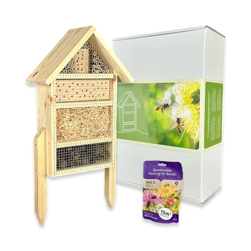 GARTENETAGE Geschenkset Insektenhotel – Nachhaltiges Insektenhotel mit Blumenwiese-Saatgutmischung Gartenliebhaber – Natürliche Materialien, fertig montiert, mit Holzpfählen