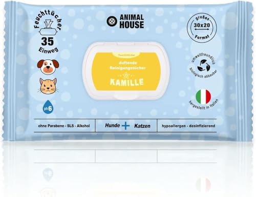 Animal House Dufttücher 35 Stück: Hypoallergene und biologisch abbaubare Feuchttücher für die tägliche Reinigung von Hunden und Katzen (35, Camomilla)