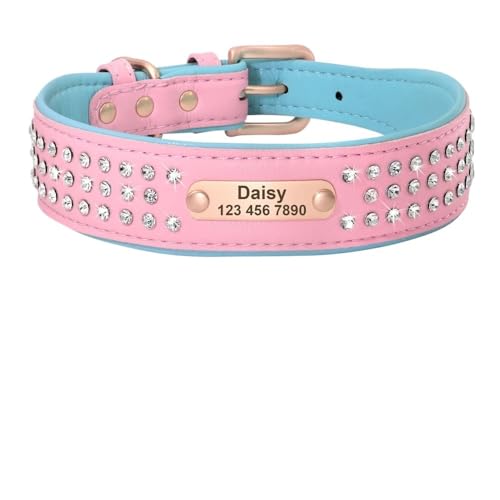 Personalisiertes Hundehalsband Bling Strass Leder Haustierhalsbänder for kleine mittelgroße und große Hunde Graviertes Haustier-ID-Namensschild(107 Pink,4)