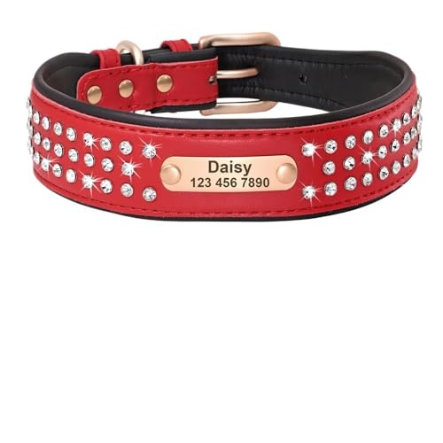 Personalisiertes Hundehalsband Bling Strass Leder Haustierhalsbänder for kleine mittelgroße und große Hunde Graviertes Haustier-ID-Namensschild(107 Red,4)