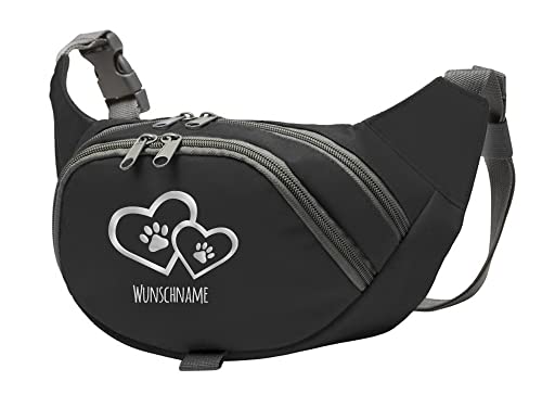 Tierisch-tolle Geschenke Hundesport Bauchtasche Leckerlie-Tasche mit 2 Herzen, 2 Pfoten und Wunschnamen personalisiert | Hundetraining | Leckerlie Beutel (Schwarz/Silber)