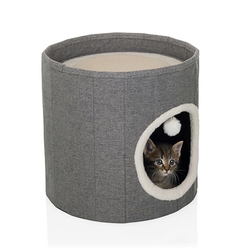 hjh LIVING Katzenhöhle mit Spielball, 38x38 cm PAWY R Faltbares Katzenhaus mit Kratzbrett und Teddy Kissen, Katzenbett Grau