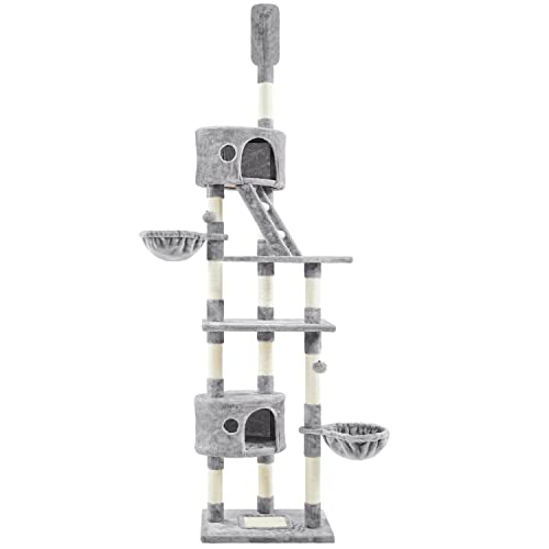 Yaheetech Kratzbaum deckenhoch XXL Kletterbaum mit 2 Katzenhöhlen und Katzenkorb Sisalstämmen Katzenbaum höhenverstellbar 228-255 cm, Hellgrau