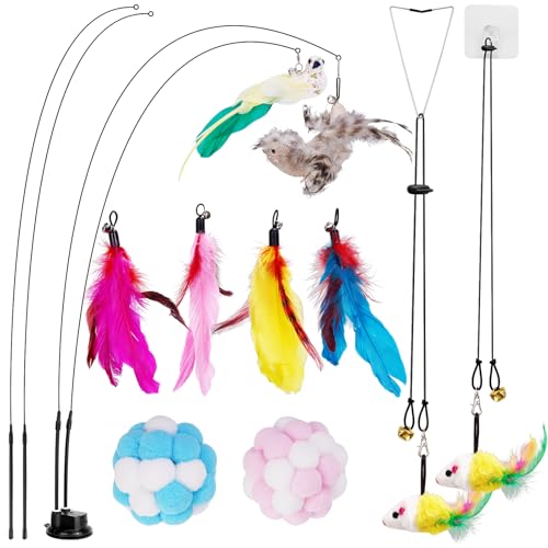 Exquisites Katzenspielzeug-Set: Unser Katzenspielzeug-Set für Selbstunterhaltung wurde entwickelt, um Ihrem Katzenbegleiter stundenlangen interaktiven Spielspaß zu bieten. Es umfasst einen Doppelsauger, ein einzelnes Saugnapf-Katzenspielzeug, einen dreieckigen Haken-Katzenspielzeug-Türhänger, vier Angelruten und acht Spielzeuge (ein orangefarbener Vogel, ein gelber Vogel, eine rosa Feder, eine blaue Feder, eine gelbe Feder, eine lila Feder, zwei bunte Fellbälle und zwei Plüschmäuse). Hängendes Katzenspielzeug: Ein sehr interessantes hängendes Katzenspielzeug. Hängen Sie das dreieckige Clip-Tür-Katzenspielzeug am Türrahmen oder an einem Griff auf. Das Viskose-Spielzeug kann an einer glatten Oberfläche haften. Dehnen Sie das Seil, um die Maus zu aktivieren. Ihre Katze wird in der Luft drehen, um sie zu fangen, springen, jagen und verrückt nach ihr sein! Ein kleiner Jäger, der interessantes Training fördert und jede Katze inspiriert. Intime Interaktion: Das zweibarsige Saugnapf-Katzenspielzeug kann zu einer Katzenangel auseinandergebaut werden, um mit der Katze zu interagieren und ihre Nähe zu stärken. Wenn Sie mit der Arbeit beschäftigt sind, können Sie das Indoor-Katzenspielzeug auf dem Boden oder Glas anbringen und Ihrer Katze beim Spielen zuschauen. Das interaktive Katzenspielzeug-Set ist auch mit Türhänge-Zubehör ausgestattet, und das Katzenseilspielzeug kann als Katzenspielzeug an der Tür verwendet werden, um Ihrer Katze tägliche Unterhaltung zu bieten. Interaktive Katzenspielzeuge für drinnen wurden entwickelt, um Ihre pelzigen Freunde nahe und intim zu halten. Fröhliches Spielzeug für Katzen: Die Kombination aus Vögeln, Federn und Bällen erfüllt die unterschiedlichen Bedürfnisse vieler Katzen. Dieses interaktive Spielzeug bietet geistige Anregung und Spaß für Ihre Katzenfreunde und hält sie beschäftigt und unterhalten. Gleichzeitig kann unser Katzenspielzeug mit seinen leuchtenden Farben und Glocken den Jagdinstinkt von Katzen unabhängig von ihrer Größe effektiv auslösen. Es sorgt für endlosen Spaß und hilft ihnen gleichzeitig, aktiv zu bleiben und ein gesundes Gewicht sowie einen gesunden Lebensstil zu fördern. Vorsicht: Wenn Sie sehen, dass eine Katze an einem Spielzeug kaut, stoppen Sie sofort und entfernen Sie es, um Unannehmlichkeiten durch versehentliches Verschlucken zu vermeiden.