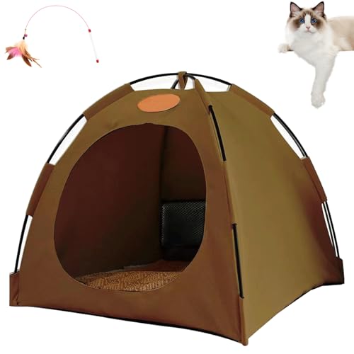 Katzen Kühlzelt, Kühlzelt Katze, Abnehmbares Zelt Mit Kühlender Bettmatte, Atmungsaktiv, Waschbar, Für Haustiere,Welpen, Faltbar, Für Drinnen Und Draußen (Braun, M)