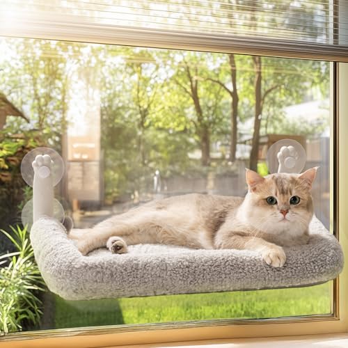 MEWOOFUN Weiche Katzen fensterhängematte – 54x30cm faltbares Katzen fensterbett mit wendbarer Matte, stabile Katzenhängematte hält bis zu 18kg (grau - mit Bett, M)