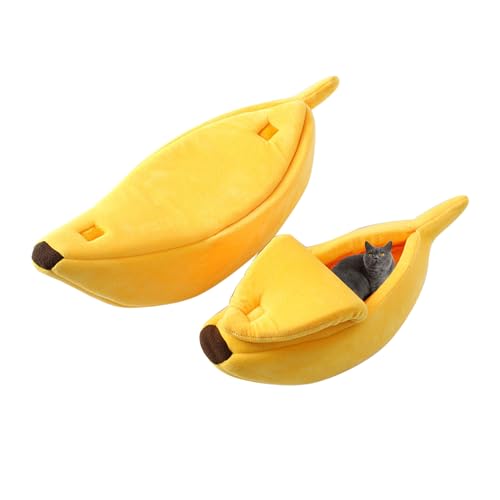 BomDog Beruhigendes Katzenbett, Katzenbetten Beruhigendes Katzenbett Kuschelhöhle Katze, Warmes Haustiernest Bananenform, Abgedecktes Katzenbett für Drinnen und Draußen (M, Gelb)