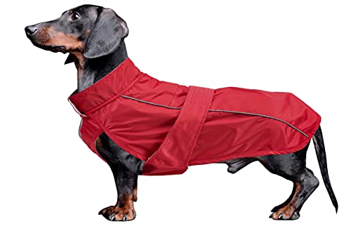 MOREZI Dachshund Regenmantel, wasserdichte Außenschicht, Fleecefutter, reflektierende Besätze, Verstellbarer Gürtel - geeignet für kleine und mittelgroße Hunde-Rot-L