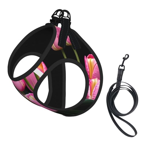 Hundegeschirr und Leine, weiches Netzgewebe, mit Tulpenmuster, bequem, gepolstert, kein Ziehen, Rosa