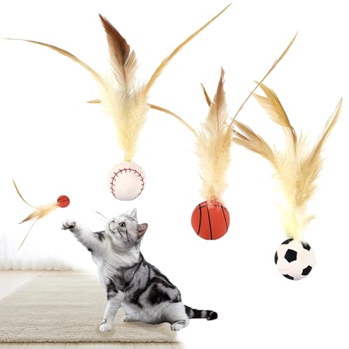 Feather Ball Cat Toy, Bouncy Tails Cat Toys for Indoor Ourdoor Cats, Mini Basketball Soccer and Baseball Interactive Bouncy Ball for Cat Dog Pet Toys Gift (3*A)