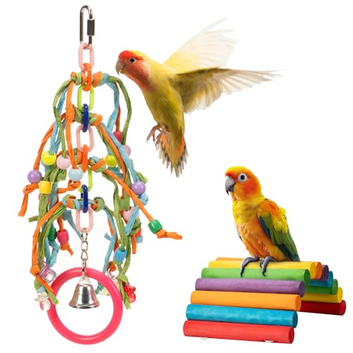 Ideal für kleine Papageien: Unser Papageien-Spielzeug-Set aus 2 Teilen (Brücke und Kauspielzeug) ist perfekt für eine Vielzahl von Papageienarten, einschließlich Nymphensittiche und Wellensittiche. Farbenfroh und leuchtend: Die leuchtenden Farben und auffälligen Designs unseres Spielzeugsets ziehen die Aufmerksamkeit deines Vogels auf sich und bieten stundenlange Unterhaltung. Ein Muss für jeden Vogelbesitzer. Kauspielzeug mit Ring zum Aufhängen: Das im Set enthaltene Kauspielzeug bietet deinem Vogel nicht nur glänzende Unterhaltung, sondern hilft auch, seinen Schnabel in Form zu halten. Robuste Brücke: Die stabile Brücke ist mit verschiedenen Dekorationen ausgestattet, die zusätzliche Spielmöglichkeiten bieten. Dieses Spielzeug fördert das aktive Spiel und die körperliche Fitness deines Vogels. Langlebige Edelstahlhaken: Die Haken unseres Spielzeugs sind aus rostfreiem Edelstahl gefertigt, was sie sicher und langlebig macht. Hält auch bei intensivem Gebrauch und bietet sichere Unterhaltung für deinen Vogel.