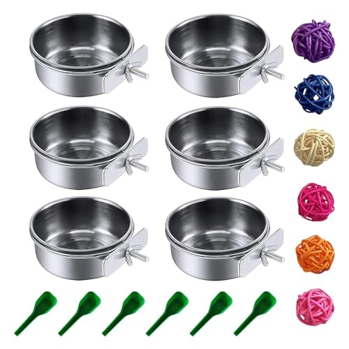 Swiixxer 6 Stück Vogelfutterschalen Aus Edelstahl für Papageien, mit Klemmhalter und Vogellöffel